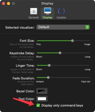 默认情况下,不止是快捷键会显示键盘图标,打字也会显示字母,如果只想显示快捷键图标,可以在 KeyCastr 的偏好设置 – Display 里面勾选「Display only command keys」。