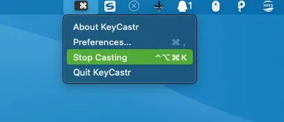 如果想关闭键盘图标的显示,可以点击屏幕左上角状态栏中的 KeyCastr 软件图标,然后点击「Stop Casting」 ,也可以退出 KeyCastr 软件。