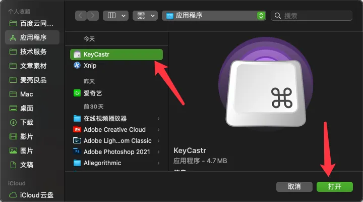 如果是 10.14 或更低版本的系统,KeyCastr 不会出现在「输入监听」里面,你可以手动将其添加到「辅助功能」里面。