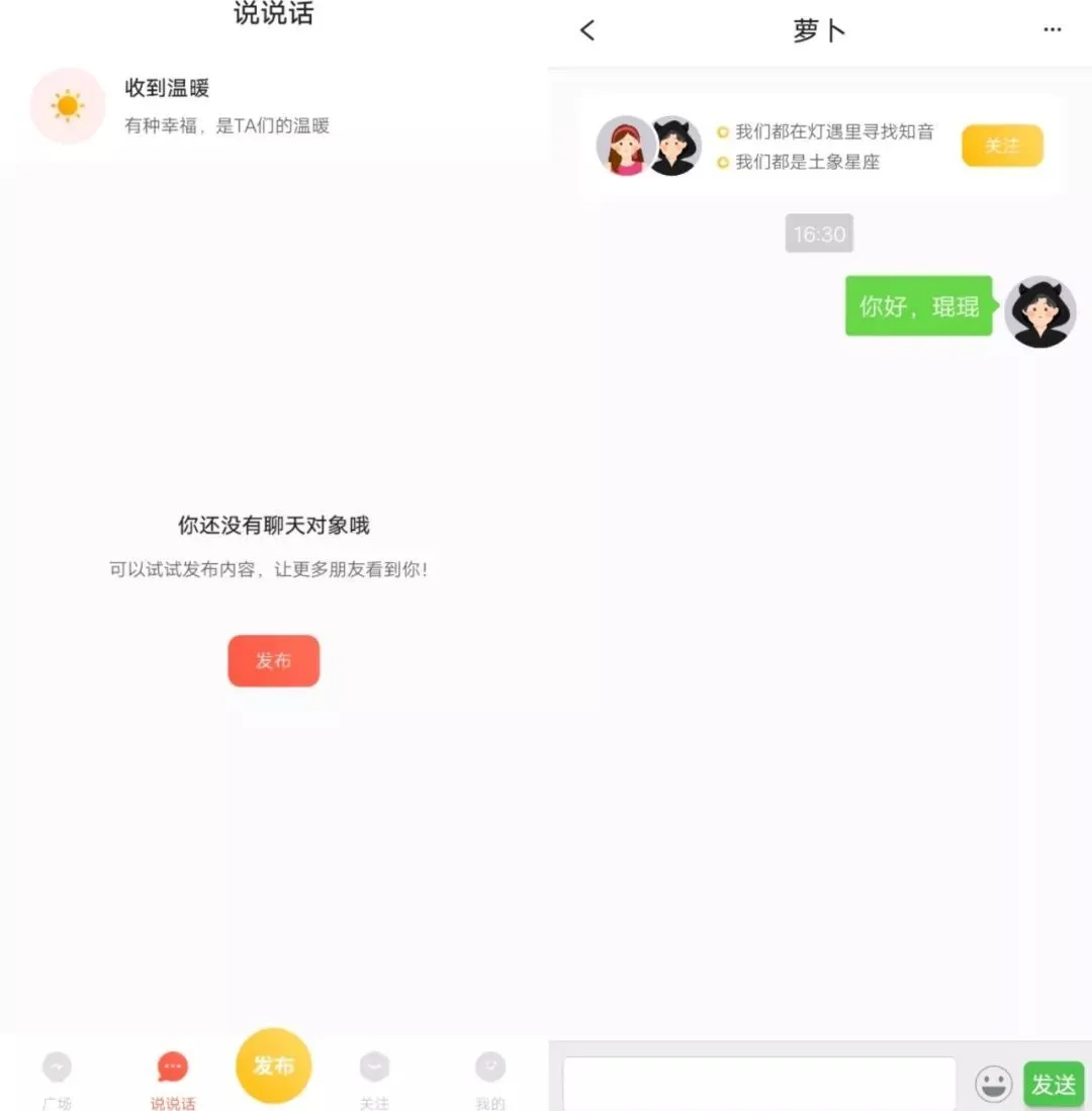 从产品端来看,灯遇交友的主要功能是主打匿名聊天,产品设计上分为“广场”、“说说话”、“发布”、“关注”、“我的”这四个功能。