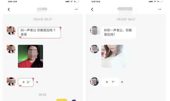 值得注意的是,这些“美女”搭讪的语言几乎雷同,有的发一句“叫你一声老公,你敢答应吗?”再配一张美颜照片和一段语音;也有一部分人发一句“离异单身,介意交个朋友吗?”同样也配一张照片。