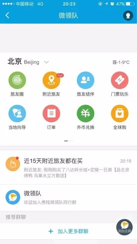 实际上,携程新推出的社交功能此前就已埋下伏笔。2015年,携程开发了“微领队”功能,这是一款针对自由行行中服务的产品,可以预定机票、酒店、自由行、火车票等,同时可以将相同时期的旅友聚集在微信群或携程APP的微领队群中,提供目的地旅游信息问答服务和意外情况的支持(如重要护照丢失,受伤等),结伴同游的社交服务,并根据旅友不同的兴趣,组织各种类型的目的地聚会活动(如年轻人聚餐、海滩亲子活动、当地酒吧串游等)。还可以推荐游客急需的当地旅游产品。