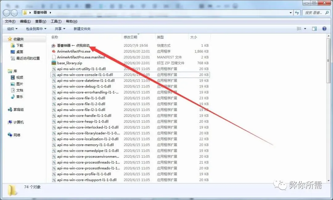 第一步:把下载的文件进行解压,找到“看番神器 ← 点我启动”,点击启动软件。