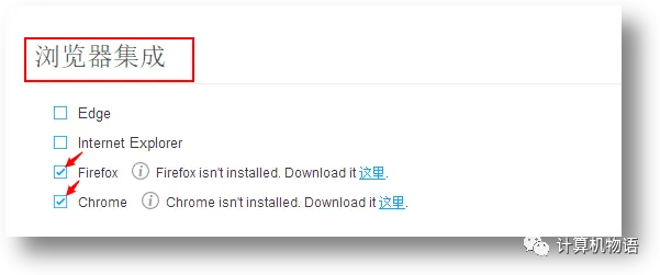找到浏览器集成——勾选 自己在使用的浏览器(使用360极速浏览器或者是其它Chrome的同学勾选Chrom即可)