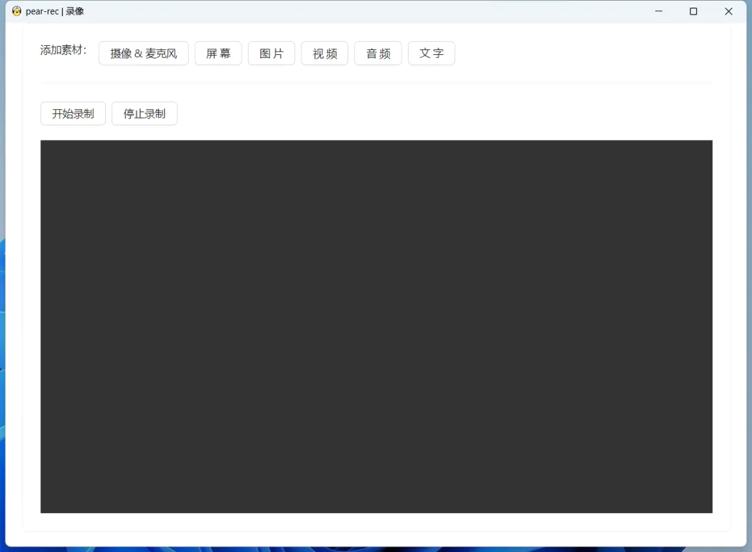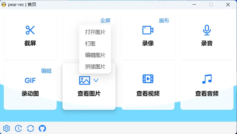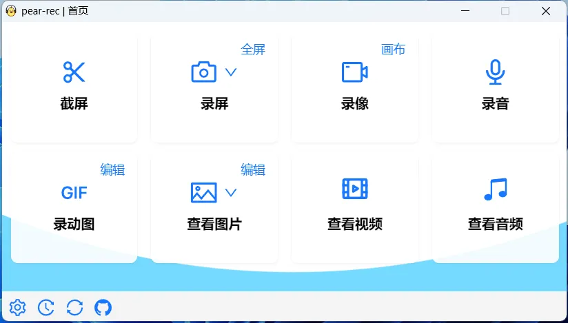 从主界面能够看到,根据功能分类,pear-rec 可以分为八大功能:截屏、录屏、录像、录音、录动画、查看图片、查看视频、查看音乐。
