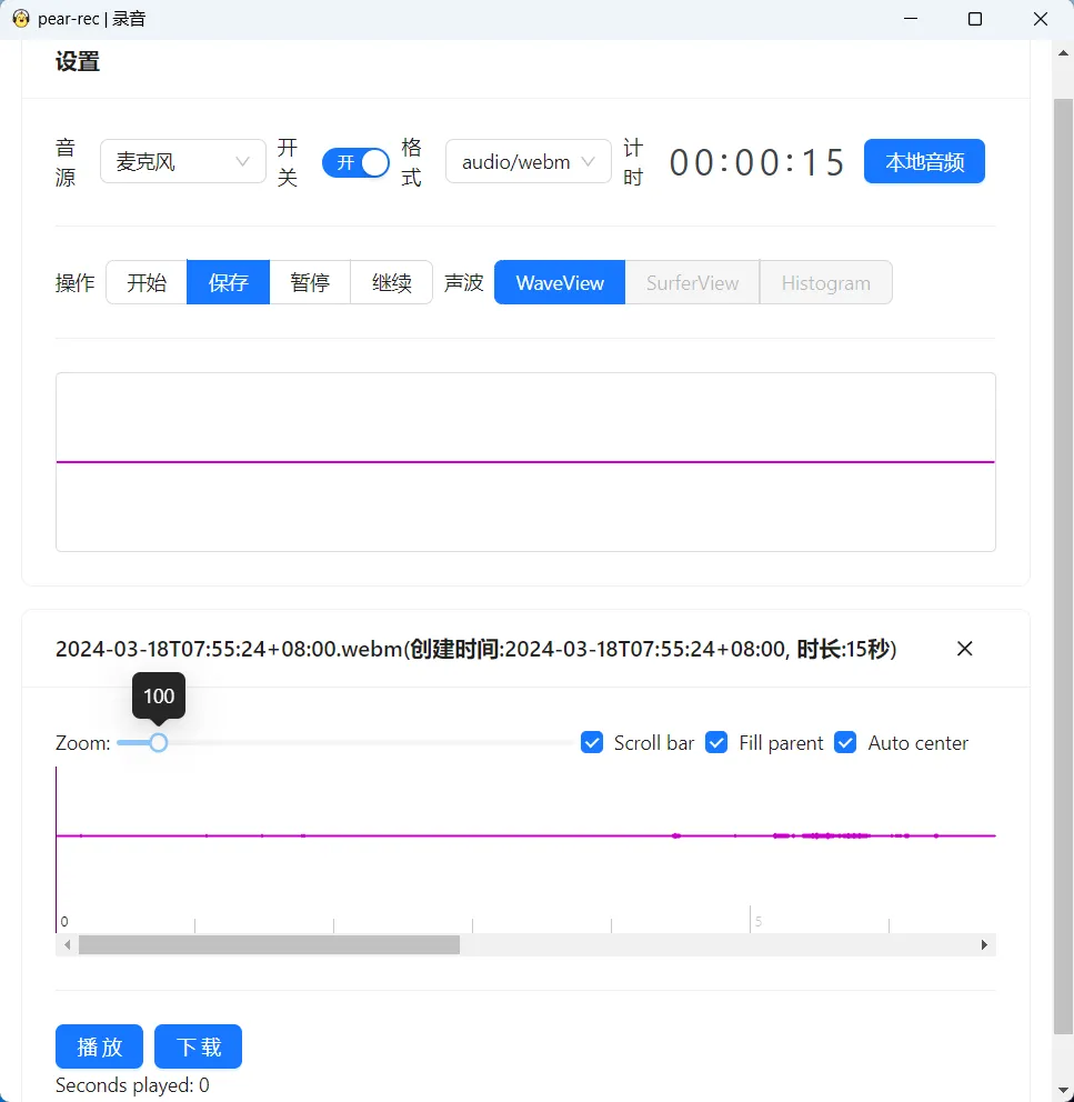 录音也比较常见,录音音源包括麦克风声音和系统声音,点击“开始”之后将会开始录音,点击“保存”保存音频文件到本地。