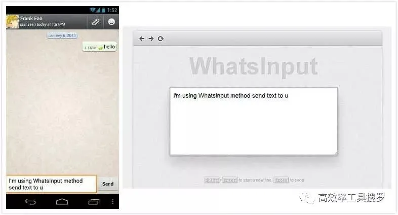 WhatsInput 是一款输入法,通过WiFi,就可以使用你的电脑向手机输入内容(当你的手机连接电脑的WiFi,或者手机和电脑连接同一个WiFi 时),在浏览器输入类似http://192.168.1.100:6688,就可以使用了。