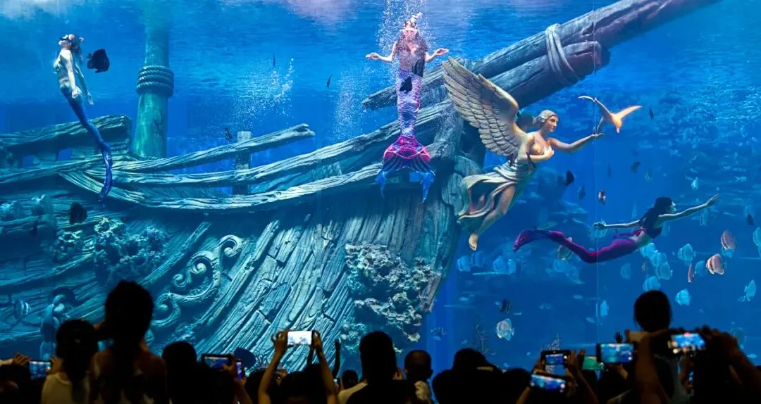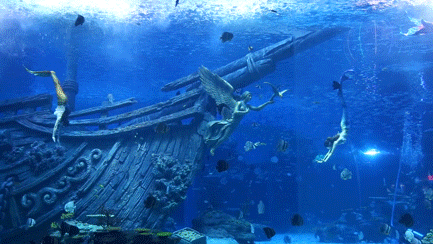 “哇,美人鱼”一个小孩子清脆的声音吸引了我,不由自主就跟着走了过去。大型透明的玻璃墙幕里,四位美丽的人鱼公主正在翩翩起舞,我跟着她们的身姿,看水花波澜,看点点泡沫,看摇曳的海底生物,思绪不由地飘远:小时候我也有一个人鱼公主的梦呢,看了《海的女儿》后我缠着爸妈买玩偶,后来这只玩偶好像已经丢到老房子里落灰了吧,就像我现在灰灰的心情。此刻,真想像美人鱼一样,游上水面,透透气……