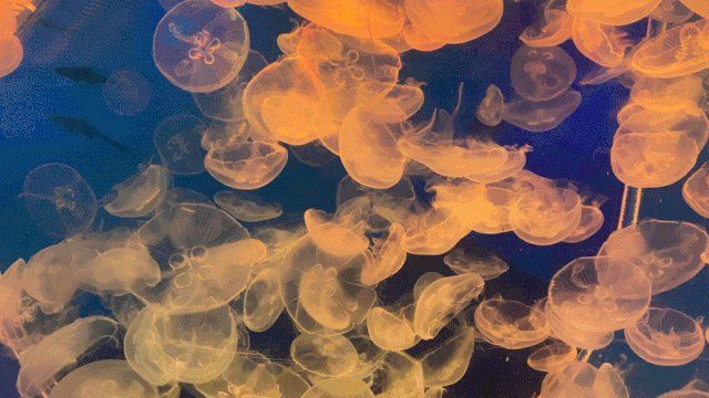漂亮的水母在水里开开合合,美得像一场梦。这些水中的精灵,半透明的身体在变幻的灯光下晶莹剔透,我看得有些痴了。大概是深蓝色的海底世界,有让人卸下心防的魔力吧,慢慢走走看看,感觉很好。工作的焦虑先放一放,不再为还未发生的事担忧,整个人都通透了。