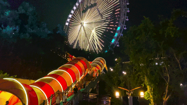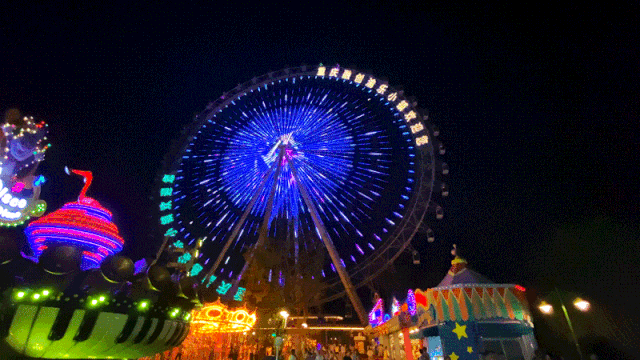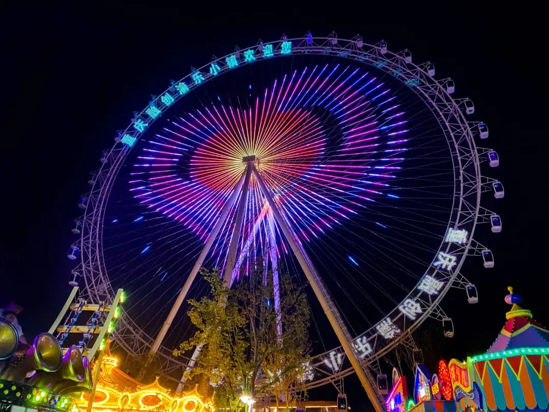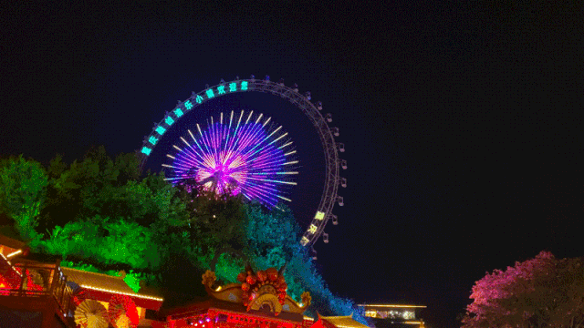 走到摩天轮下,摩天轮点亮了今晚的夜空。随着摩天轮缓缓旋转升空,小镇夜色尽收眼底。偶尔换个视角看身边的事物,视野开阔,心境也跟着开阔。山城之光绚丽夺目的灯光秀,不断变幻的迷离光影,山城之光让这里的夜色分外动人。坐过了代表着幸福的摩天轮,一定会让我们更幸福!
