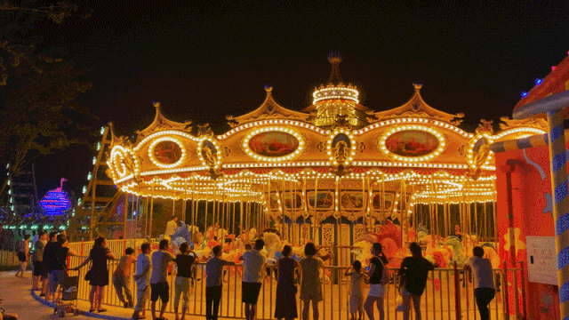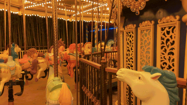 随着巡游队伍,我与浪漫的旋转木马不期而遇。缓缓转动的旋转木马,承载了我童年的纯真和快乐。暖暖的黄色灯光打在身上,音乐舒缓悠扬,身后是小朋友的欢声笑语,木马旋转起伏,童年的绮丽梦境跟现实慢慢重合,好久好久没有这么心无旁骛的享受当下了,此刻真是发自内心的满足。