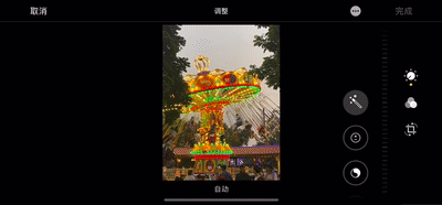iPhone图片编辑从iOS 13开始,增加了「自动」功能,一键修图,滑动下方的刻度尺调节参数的强度,往左滑动查看「自动」调节过的参数。