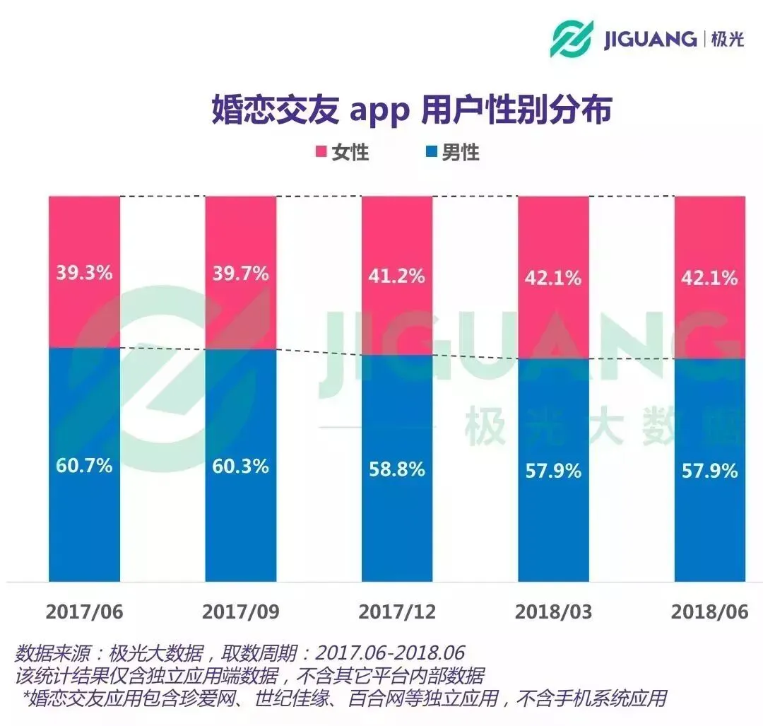 过去一年,婚恋交友app的男性用户占比有所下降,用户的整体性别分布也朝着更均衡的方向发展。极光大数据的统计结果显示,截至今年6月份,男性用户在婚恋交友app中的占比达到57.9%,女性用户为42.1%。