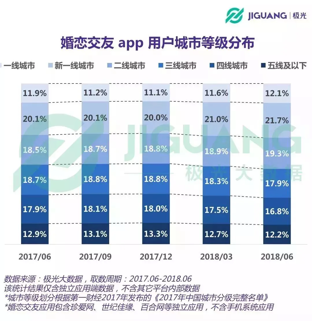 在过去一年,分布在一线、新一线和二线城市的婚恋交友app用户在占比上有所提升。截至今年6月份,分布在二线及以上城市的用户占比达到53.1%,与去年同期相比增加了2.6%。