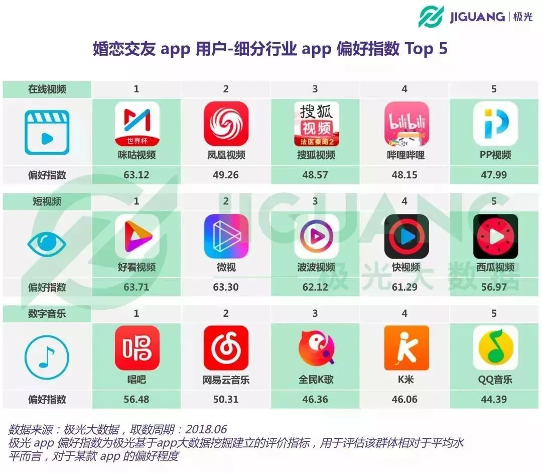 在在线视频app领域,婚恋交友用户最偏爱咪咕视频、凤凰视频和搜狐视频,二次元弹幕站点哔哩哔哩排名第四。在短视频app方面,最受该用户群体偏好的是好看视频、微视和波波视频。婚恋交友用户对K歌app的偏好属性非常显著,在该群体偏好度最高的数字音乐app中,网络K歌app占据了3款。