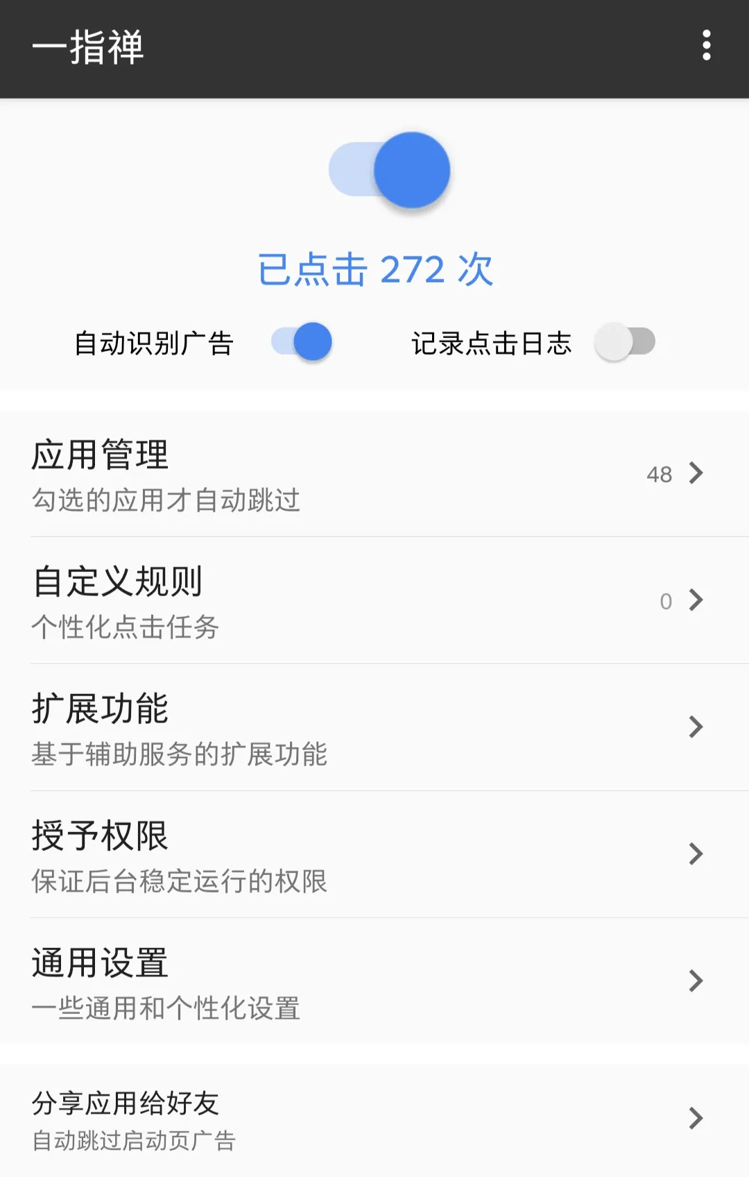 如果你想个性化一点,也可以自定义点击的规则,让软件帮你自动执行任务。另外,在右上角,软件还提供了“关闭MIUI广告”的功能。有了一指禅之后,基本上就可以对很多软件的启动页广告说“不”了。你打开应用的速度也会比别人快很多!!