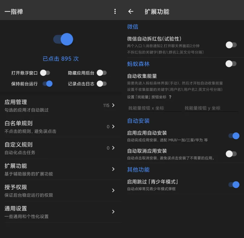 同样基于模拟点击,软件还提供了拓展功能,包括「微信自动抢红包」、「微信自动登录」、「QQ/Tim自动登录」(新版本下线此功能)、「应用自动安装」、「跳过青少年模式」等功能。