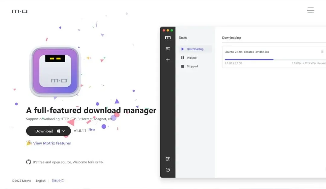 Motrix开源软件,star 也高达近 22k,界面非常清爽简约,而且是一个全能型下载软件,它跨平台支持 Windows、Mac、Linux 三大系统,可以支持下载 HTTP、FTP、BT、磁力链接等。
