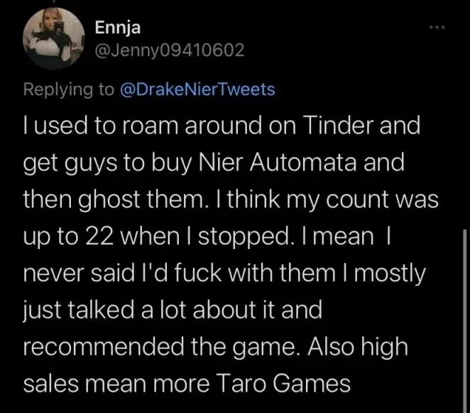据她自己统计,差不多有22名接近她的男生为此购买了《尼尔:机械纪元》。