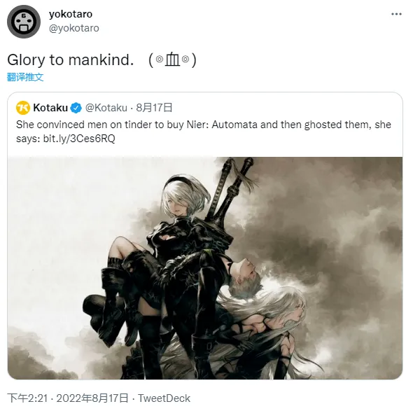 更让人没想到的是,这件事被曝出之后,横尾太郎还专门回复她一句游戏里的台词:人类荣耀长存。