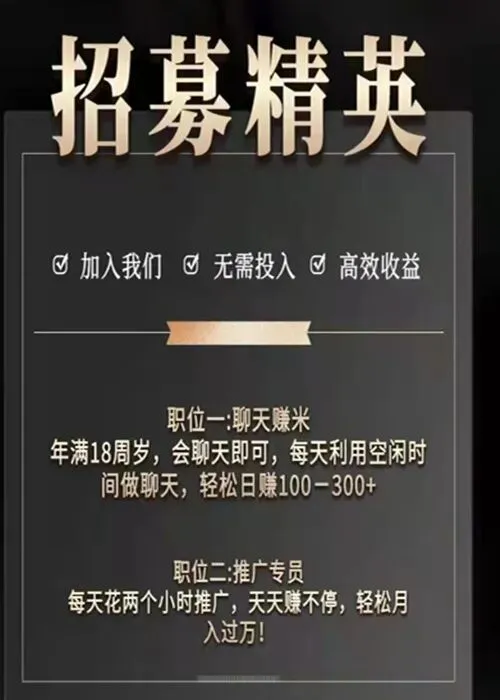 “只有引导视频才能快速升温,视频价格很高。不能给对方任何联系方式。你要和他谈对象吗?”另一边,一群自称推广员的人招募、“培训”聊天员,设法在奔爱、聊呀、心田等多款交友APP上“搞钱”。推广员发送的招聘海报宣称,聊聊天便可轻松日赚数百元。