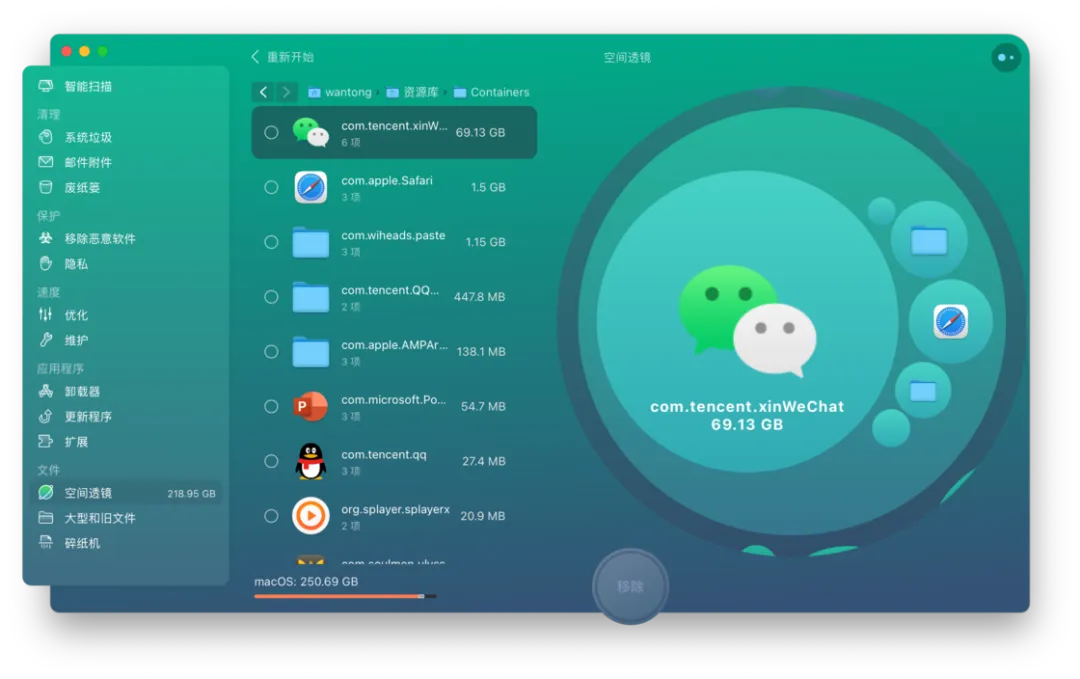 小龙哥用超前的产品经理思维告诉我,想要小而美,得加钱,下一次买 Mac,记得上 1TB 以上的硬盘。当然不加钱也有办法,看到左边的选择框了吧?勾选上,点移除就好了。啥?聊天记录?我们从不会看用户聊天记录,当然也不会保存你们的聊天记录了。噢你要导出啊?没这个功能。