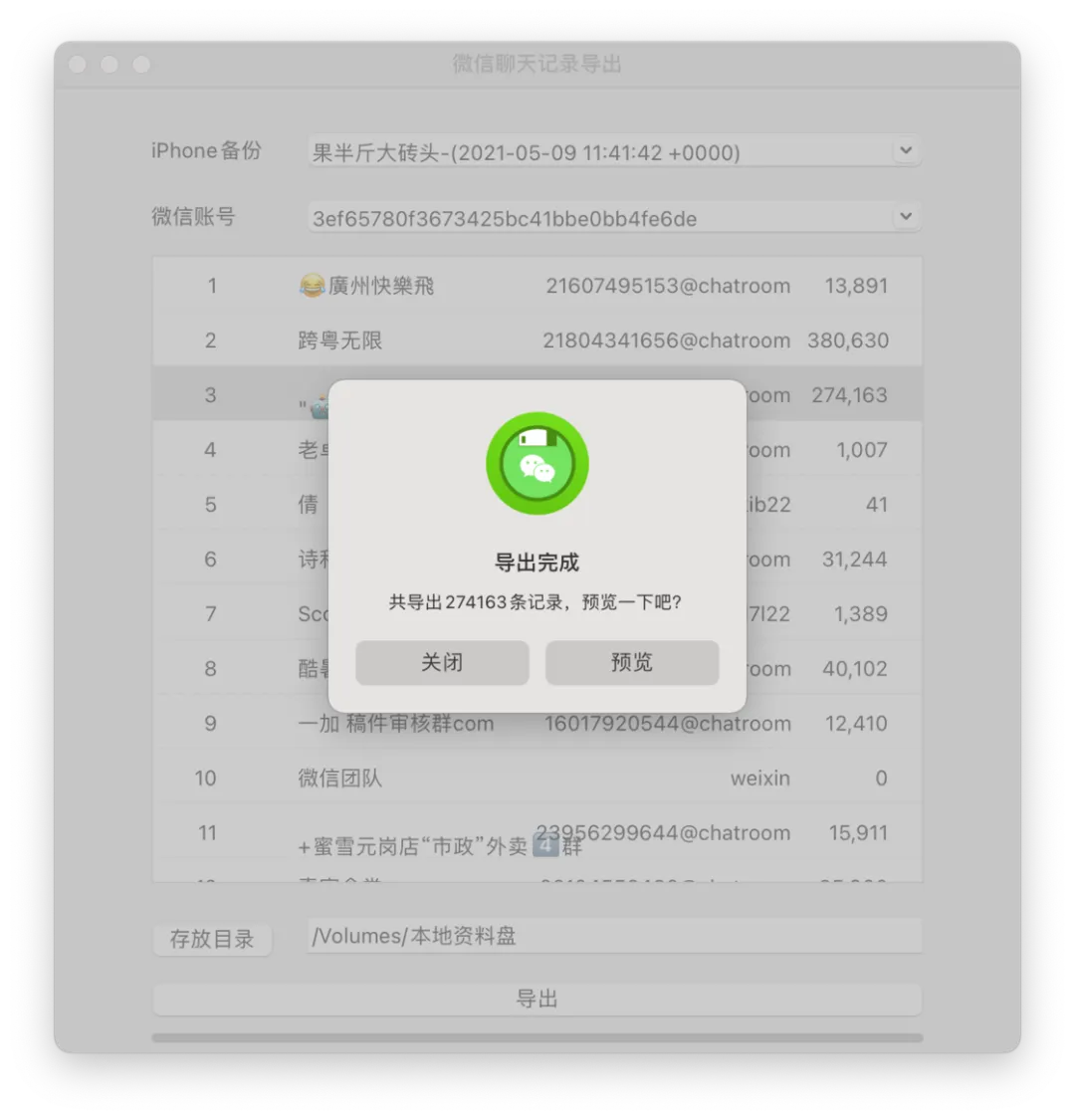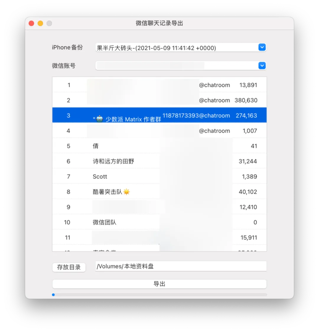 在设备和账号选择栏的下方,就是所有聊天记录的列表。尽管作者没有写各个项目的名称,但也不难猜到。第一二列自然不用说,第三列是群聊或朋友的微信 ID,第四列则是聊天记录的数目。说实话,当我看到有个群有 38 万多条聊天记录时,还是挺震惊的……