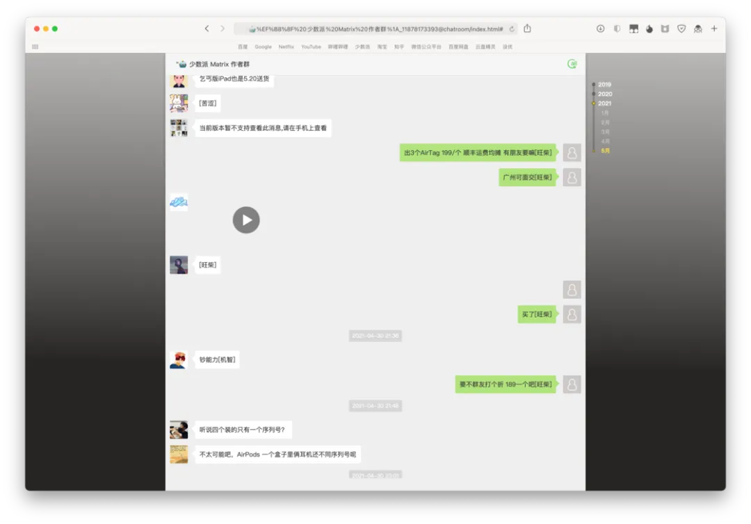 对了,在官网的示例中还能发现,导出的聊天记录还会分类图片和视频,并在右上角提供选择。但是在我实际导出的少数派作者群聊天记录中,这两个按钮并没有出现,但文件夹中的图片和视频确实是已经导出来了的,可能是一个小 bug 吧。