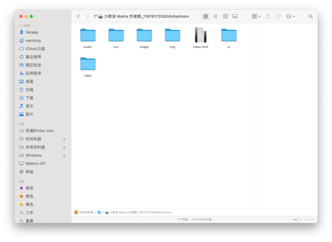 在存放目录下,每个导出的聊天列表都会以「聊天对象\_微信ID」为命名的文件夹打包,并分类成语音(audio)、图片(image)、视频(video),以及一些网页文件(css、img、index.html 等)。文字的聊天记录则是存在「js – message.js」文件中。