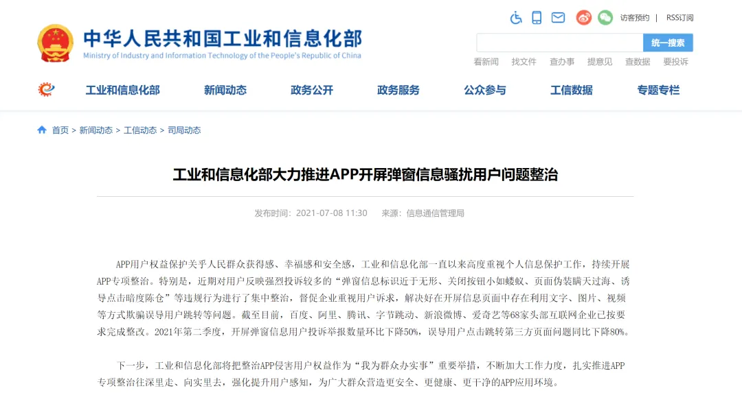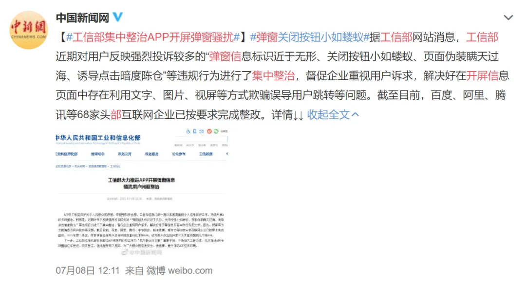 “截至目前,百度、阿里、腾讯、字节跳动、新浪微博、爱奇艺等68家头部互联网企业已按要求完成整改。2021年第二季度,开屏弹窗信息用户投诉举报数量环比下降50%,误导用户点击跳转第三方页面问题同比下降80%。”