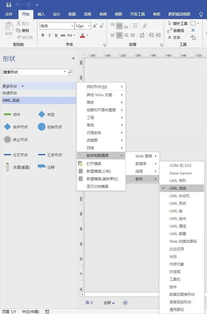 那么该如何制作一个业务流程分析图,或者说如何做一个UML活动图呢?我们就按照下图中所示那样,先在【更多形状】的下拉选项中选择【软件和数据库】,再选择【软件】及其下拉选项中的【UML活动】,所有关于UML活动图的图形便都出现啦!