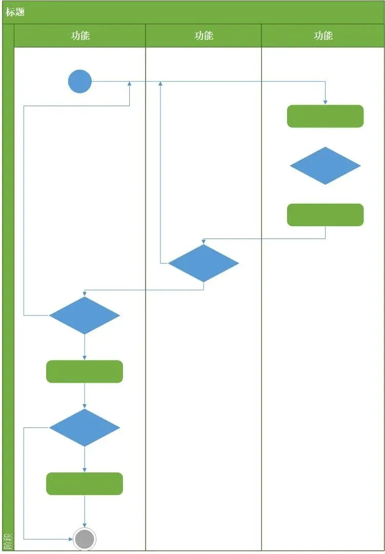 与在Visio里画其他流程图一样,在制作UML活动图时也可以直接通过拖拽模块对整个图面进行调整。从下图中可见,在Visio中制作业务流程分析图,不仅可以针对不同的业务单位和不同的业务流程进行逻辑判断,还可以对其中的业务流程起到分析作用。