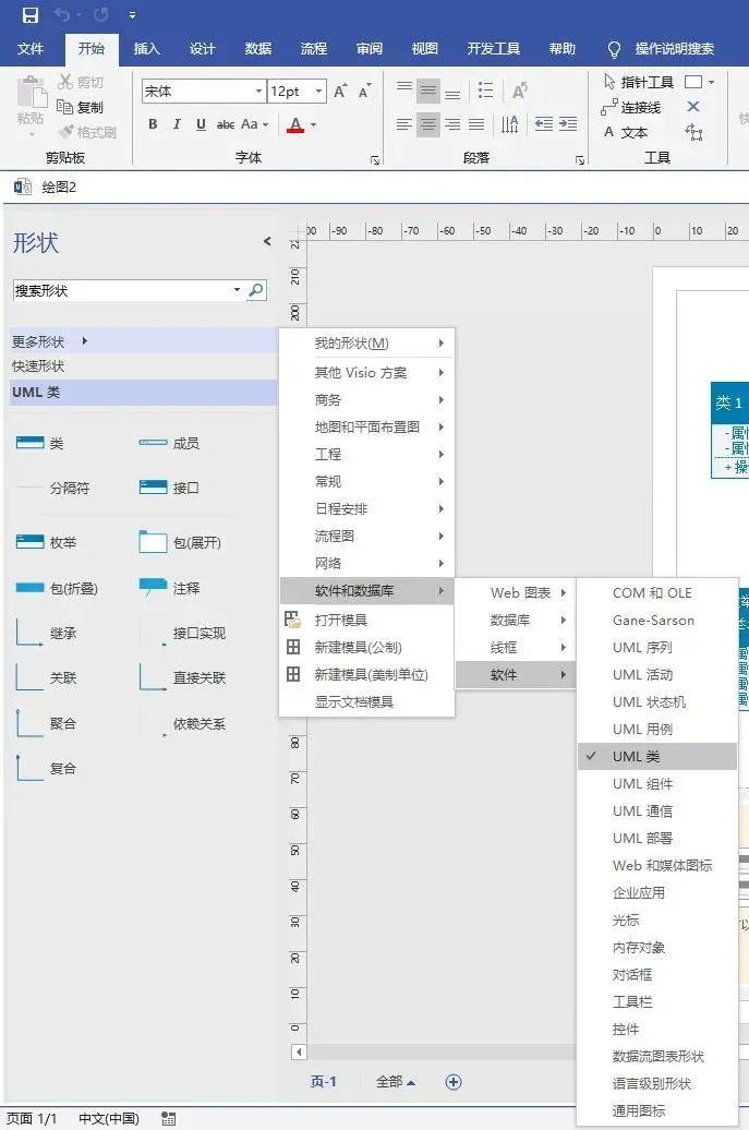 打开制作UML类图界面的方法其实和打开制作UML活动图界面一样,从下面两张图中可以看到,制作UML类图也是从【更多形状】的下拉选项中选择【软件和数据库】,再继续选择【软件】及其下拉选项中的【UML类】来选择制作UML类图时想要用到的图形形状,在这个界面中可以选择直接将左侧的模块拖动到右侧空白区域进行绘制并制作出对应的类图,接着,再通过拖拽、修改主题、隐藏结构等方式对其进行调整和美化。
