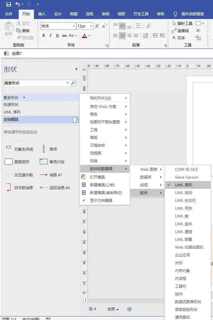 如下面两张图所示,要想制作一个时序图,就得先在【更多形状】的下拉选项中找到【软件和数据库】,以及【软件】下拉选项中的【UML序列】,便能打开制作时序图时所需要用到模具的界面。在左侧选中想用的图形形状并将其拖拽至右侧绘图页的空白处来绘制图表,也可以通过拖动激活形状端点以及其他交互操作数来对整个时序图进行绘制和调整。