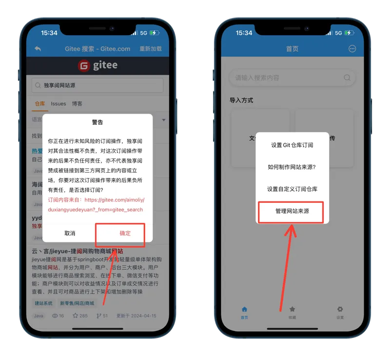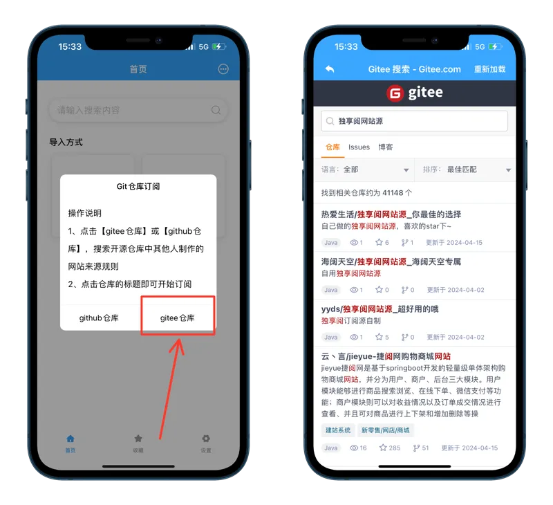 之后我们选择【gitee仓库】-点击任意搜索到的仓库名称,导入订阅源。如图所示: