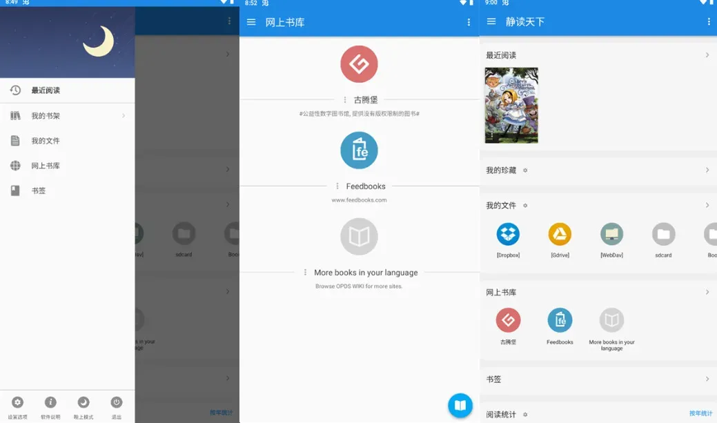 静读天下是一款广受好评的电子书阅读应用,集成了包括古登堡计划在内的多个在线书库,提供丰富书籍和杂志资源。
