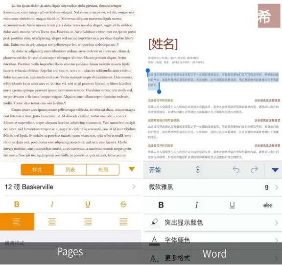 Pages 和 Word 都将编辑功能设置在应用顶部,从文字样式更改页面看,两款 App