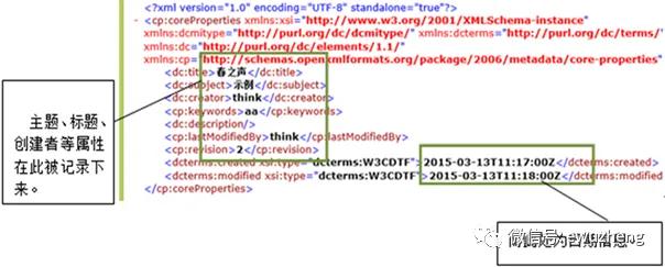 依据document.xml文件内容可以判断文件是否同源,但若要进而实现“谁复制于谁”的分析,则可结合core.xml文件内容完成。core.xml位于docProps文件夹中,其内存放着创建者、最后修改者、创建时间、修改时间等重要文件属性(如图4所示)。可依据上述内容辅助判定文件的最早版本。需要指出的,core.xml文件中与时间相关的信息采用格林威治时间进行存储,实践中需要将其转换为北京时间。