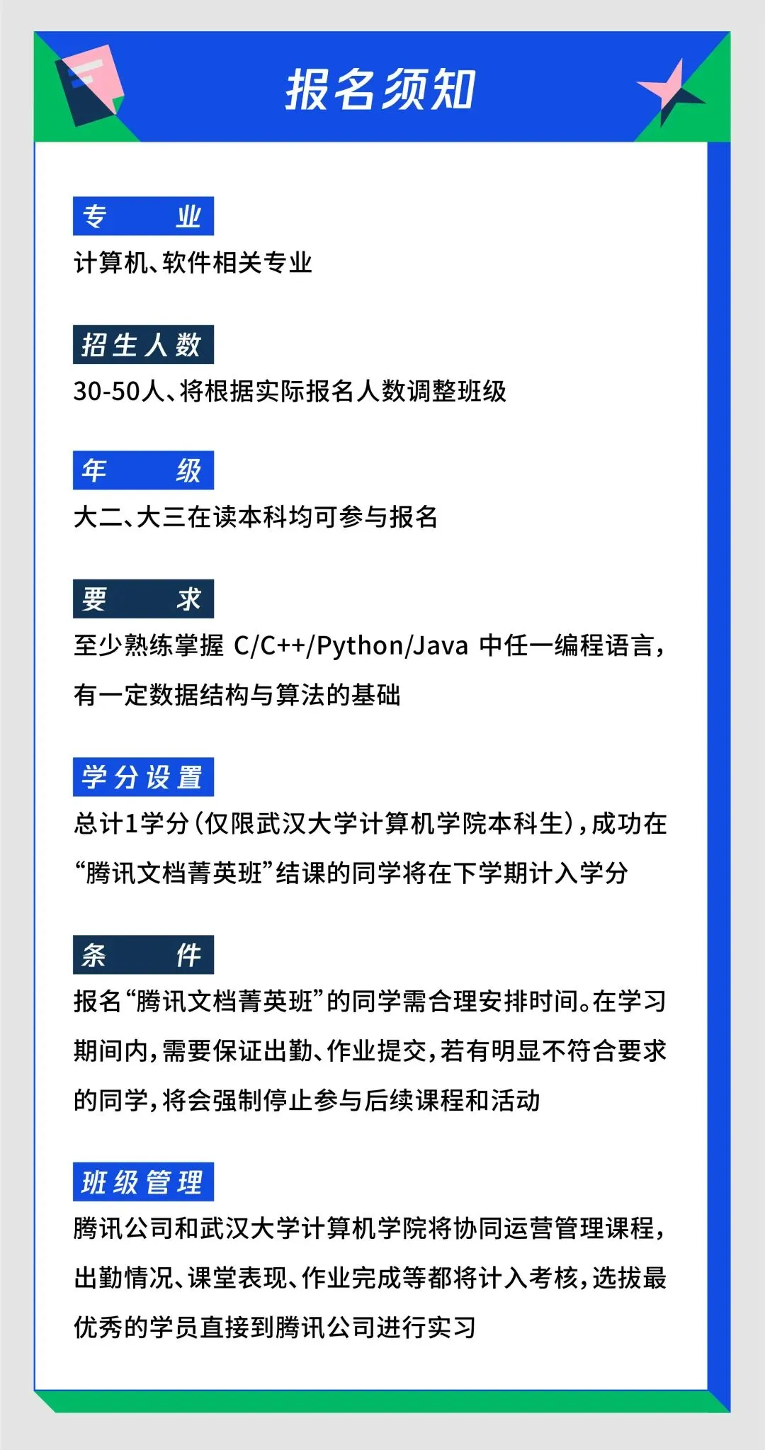 招募启动 | 武大-腾讯文档菁英班 WHU 计科先锋 武汉大学计算机学院自己的微信公众平台 我们致力于用新媒体为我院学生提供最实在的服务 因为有你,我们不断完善 排版:李蓉钧 审核:杨光亚 朱锐婕 熊意达