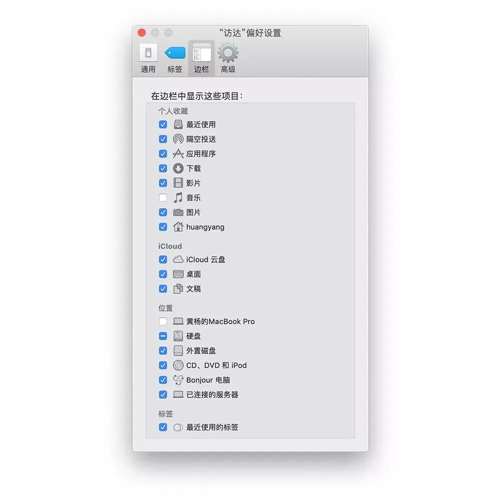 打开「访达」偏好设置,可以设置边栏。可以显示一些边栏,或者隐藏不常用的边栏。比如在边栏显示「下载」文件夹、「iCloud 云盘」、「桌面」等。