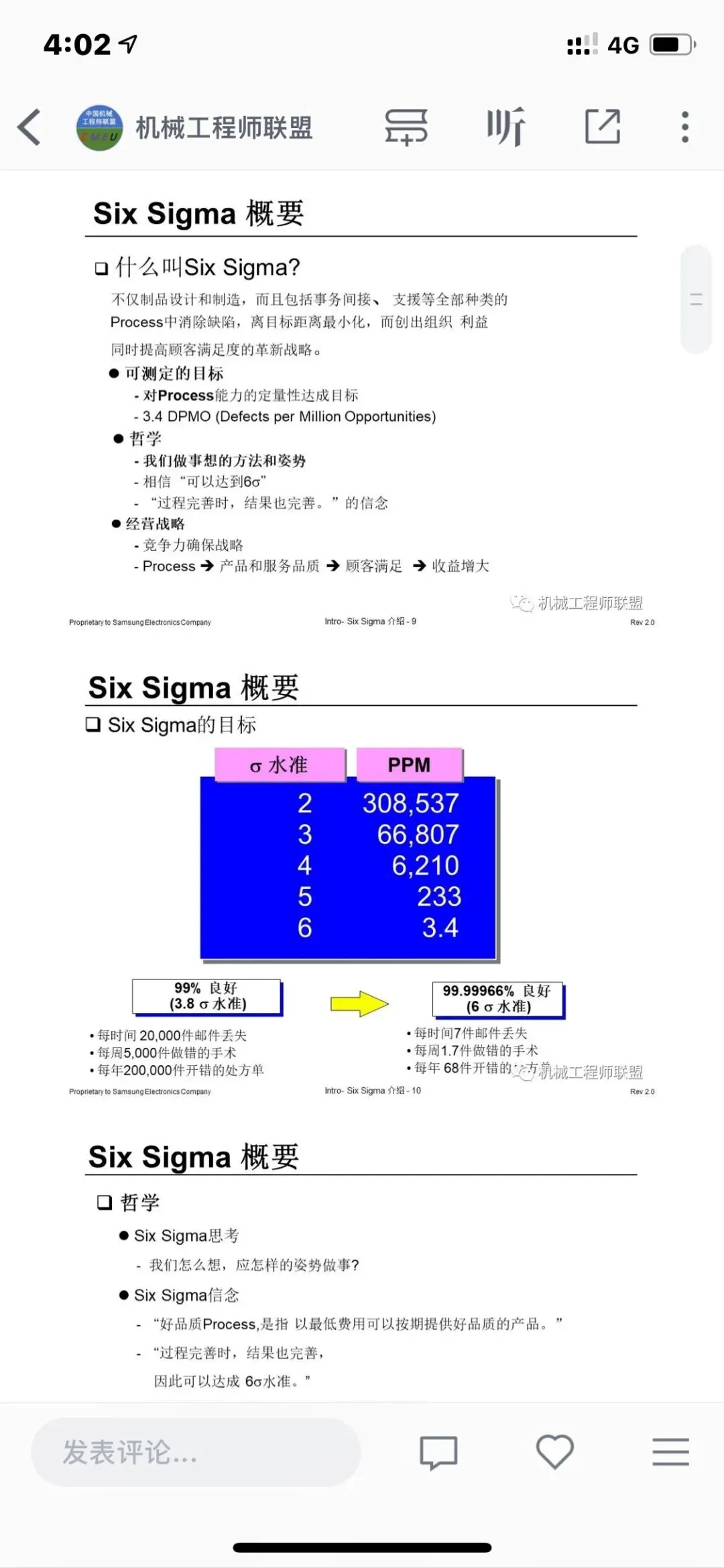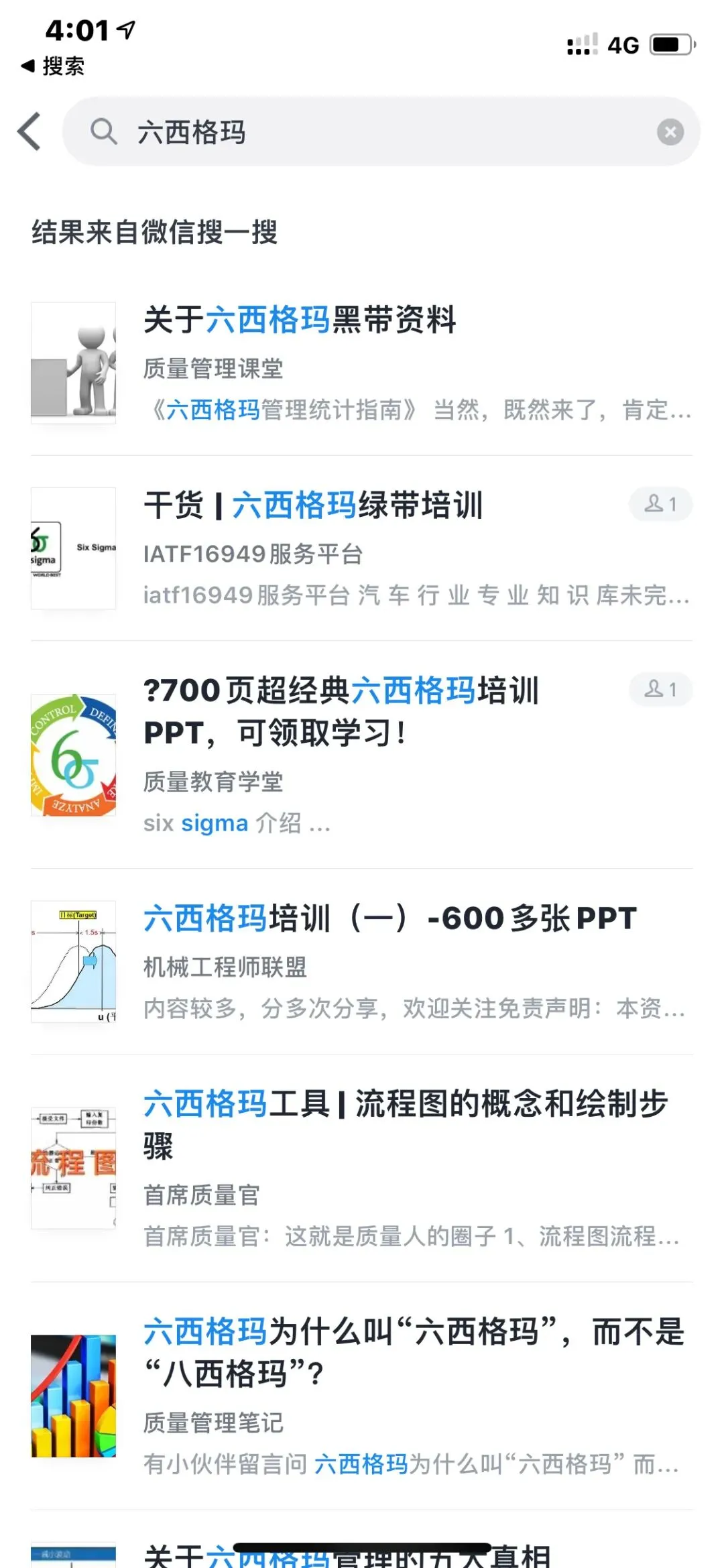 比如另一节网课里,老师提到了「六西格玛」,于是就用它来搜索,找到了一篇公众号文章,里面有一份不错的课件,马上收藏文章!