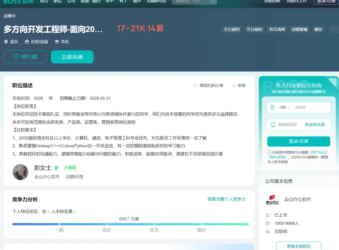 金山办公软件招多方向开发工程师-面向2026届岗位,17–21K·14薪,工作地址:武汉江夏区金山集团武汉总部大楼,面向本科及以上学历毕业生
