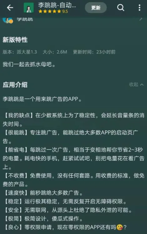 4、再说跳过广告的功能,为什么想首推『李跳跳』呢,因为它能对多款APP跳过广告,比另两个软件都要强。它还支持隐藏后台、微信/QQ自动确认登录(需要自行设置)、跳过网易云更新弹窗、跳过抖音更新弹窗等等。此外,『轻启动』的某些功能还要收费,『一指禅』的功能花里胡哨。总之,免费软件比收费的功能还要强大,酷安市场中,高达9.5分的神器。
