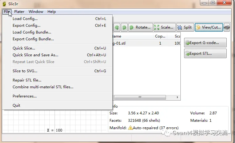 可以导出为obj格式,导出的obj格式必定可以直接用于G4的CADmesh,然而许多stl转的obj格式都存在平移的问题,这点注意一下即可。具体方法为点击菜单的修复STL文件,如下图