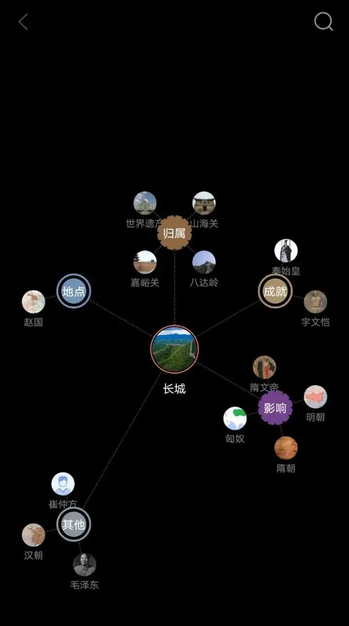 下图是搜索长城的关系图,涉及到的人和其他事件都显示的清晰明了,像思维导图一样直观,点击事件还有简单的介绍,知识点串联的效果超级强大。