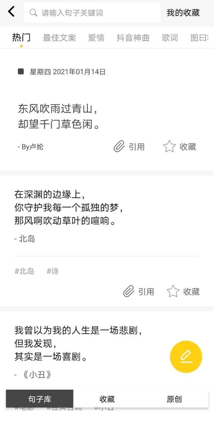 不仅是图片,超级多的文案句子也供你挑选,分类清晰,如果你想发个朋友圈不知道怎么配图配文,也可以进来看看哈哈~
