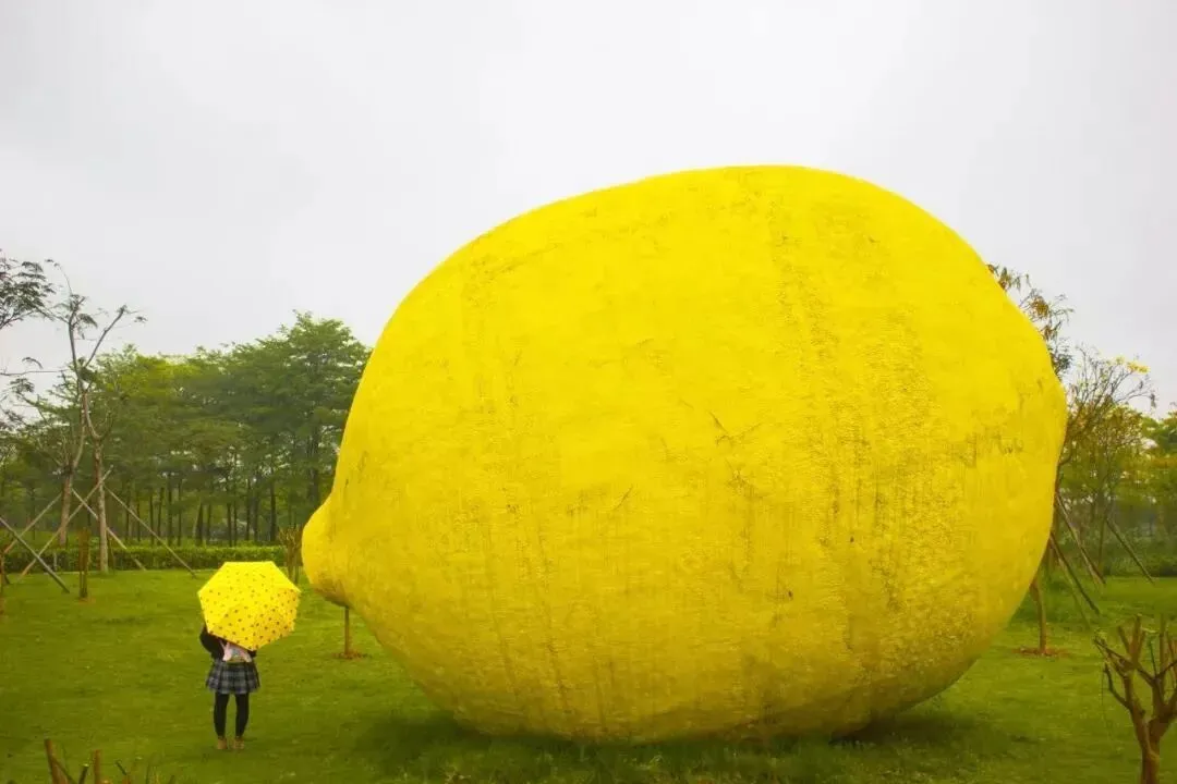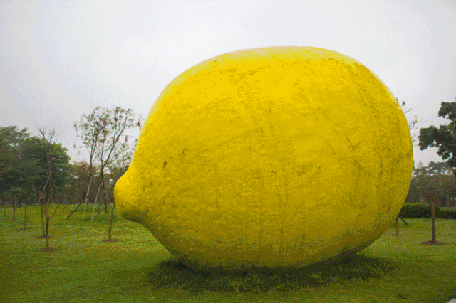 为什么把这里叫柠檬精公园呢,因为里面真的有一颗超大的柠檬雕塑。远看还不觉得,走近了一对比,真的有两层楼高,货真价实的柠檬精无误。