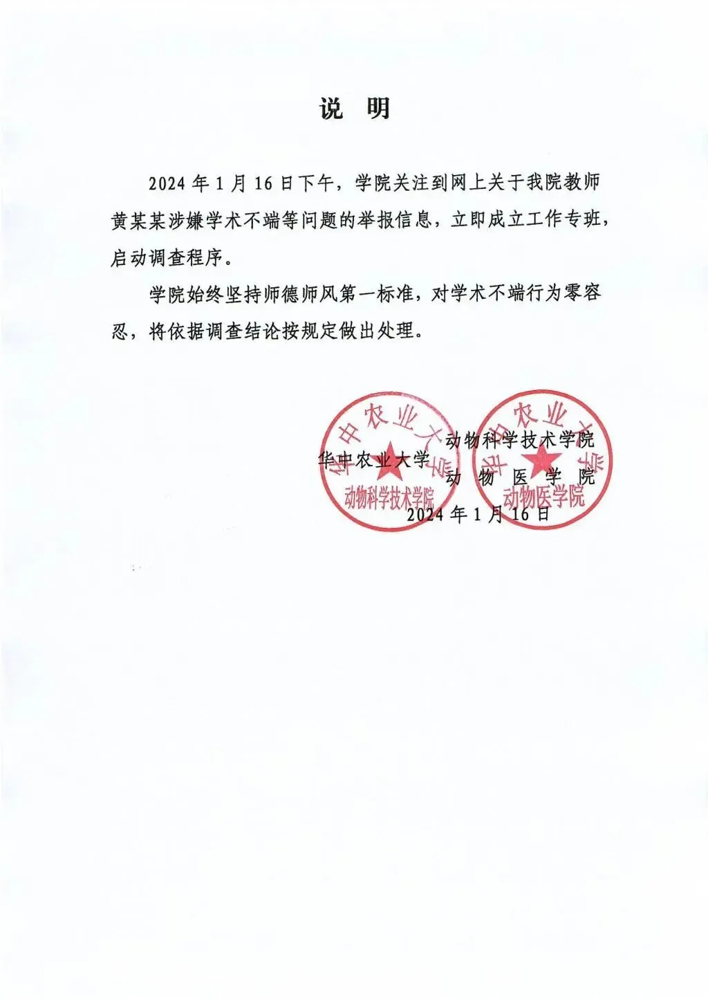 1月16日下午,学院关注到网上关于我院教师黄某某涉嫌学术不端等问题的举报信息,立即成立工作专班,启动调查程序。