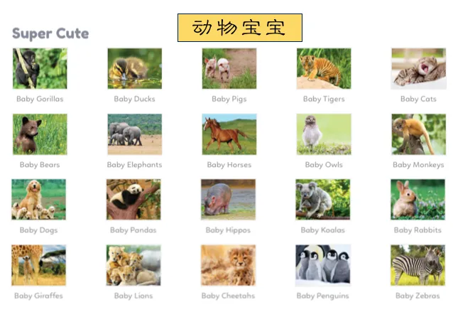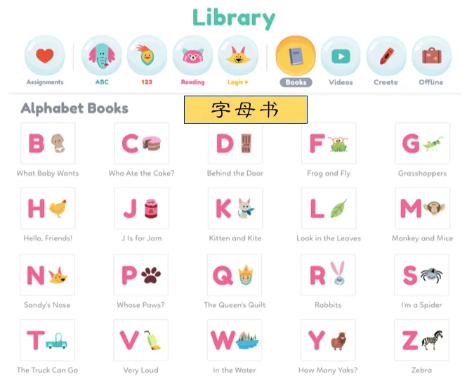 在“图书”这个栏目下面,又有故事、字母、情绪、汽车、自然、动物等等十几个分类。