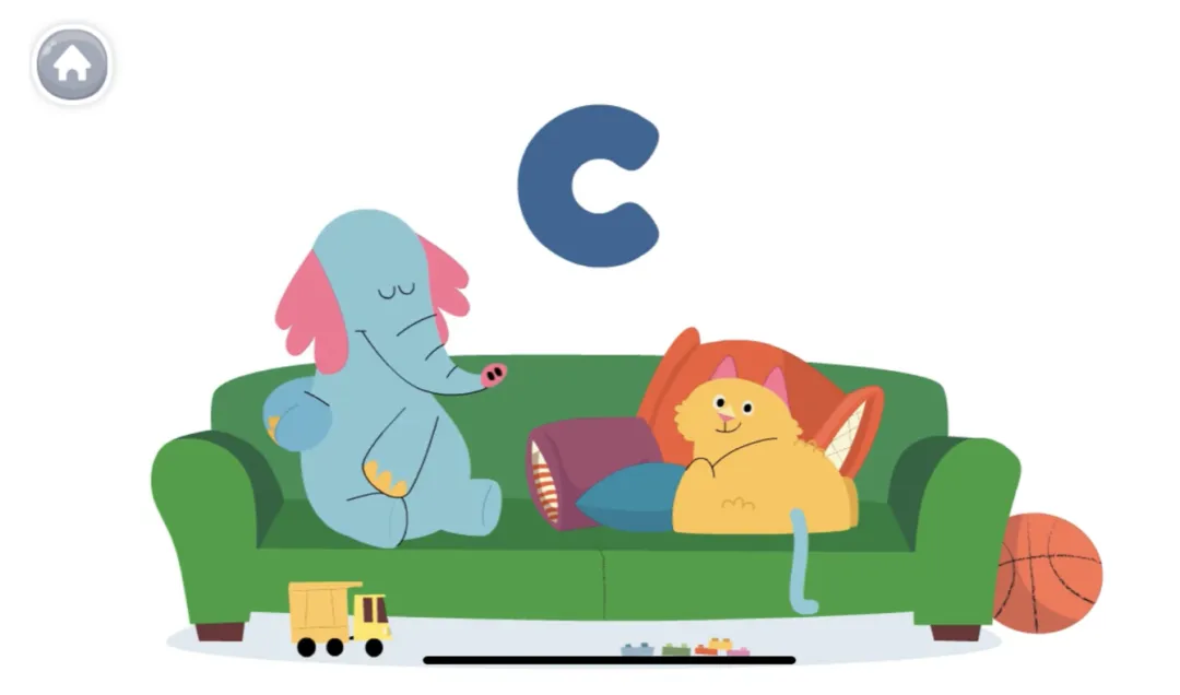 比如我们选择学习字母C,那么第一个出现是一个小视频,讲解大小写字母Cc,以及它们在单词中的发音k。